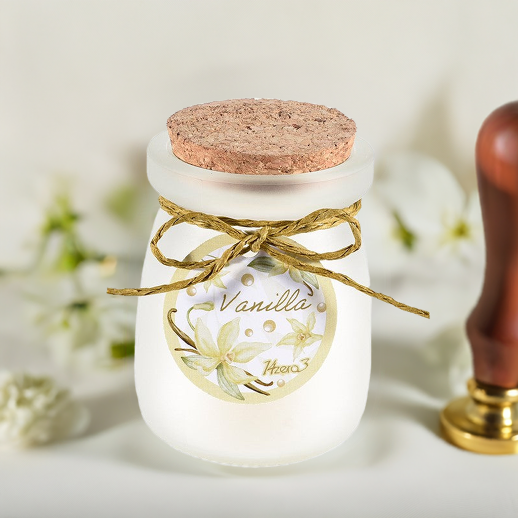 Ароматна свещ Frutti в малко стъклено матирано бурканче, с капаче от корк и конопена панделка. Ароматни нотки на плодове.