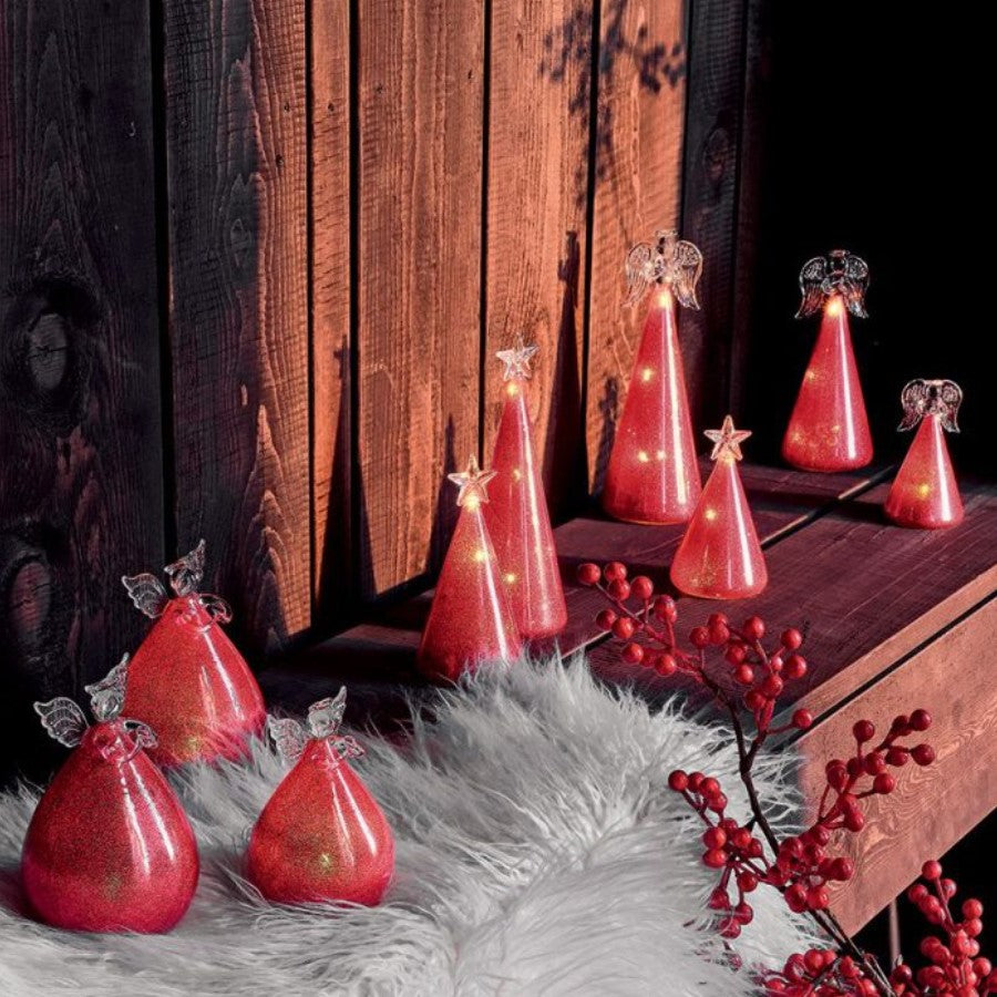 Колекция Christmas Brera - светещи коледни ангели и елхички от стъкло, с лед светлини, с тяло от червен брукат. Ще направят Коледата лъскава, блестяща, шик.