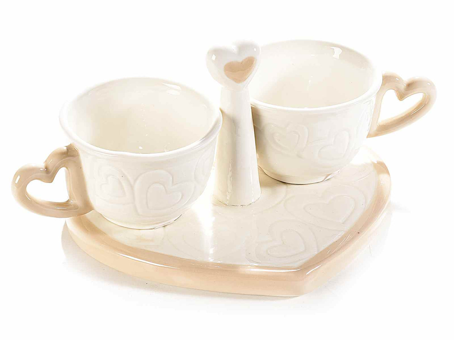 Комплект чашки за еспресо с дръжка сърце и поднос във форма на сърце, за да изненадаш любимата/любимия с романтична обстановка за сутрешното кафе. Комбинира се прекрасно с комплект захарника + каничка от същата линия.