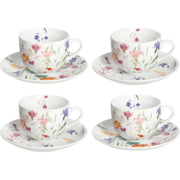 Комплектът от 4 чаши за капучино Flora с капацитет 230 мл, декорирани с полски цветя, дори и от вътрешната страна на чашата, и е идеален за комбиниране с другите аксесоари от линията за пълен и координиран комплект.